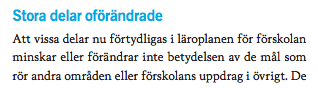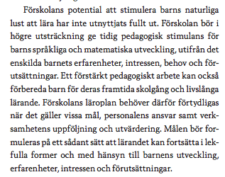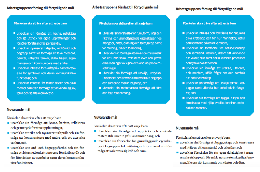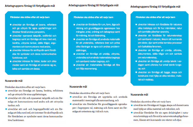 Nedan ser i ett urval av de förändringar regeringen gjorde i läroplanens målbeskrivningar. För att inte trötta ut er kan de översiktligt sammanfattas med att man försökt efterlikna skolans kunskapskrav med större fokus på reflektion, argumentation, resonemang, ”samtal om” osv. Förskolan skulle bli mer lik skolan. Oavsett vad man tycker om det är det uppenbart att ambitionen för förskolan höjdes.