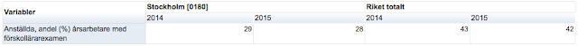 Vilka möjligheter har då förskolechefer, förskollärare och barnskötare fått att nå upp till de här högre kraven? Jag har valt ut Stockholms kommun som exempelkommun eftersom Lärarförbundet i Stockholm och Stockholm stad hamnat i spännande ordväxling kring förskollärares möjligheter att utföra sitt arbete samt kommunens beslut att erbjuda mer tid till föräldraledigas barn. Hur har barngruppernas storlek och personaltätheten förändrats i Stockholm och i landet som helhet? Samt hur stor är andelen förskollärare nu när förskollärarna fått ett tydligt ansvar för den pedagogiska verksamheten (tyvärr fanns inte statistik längre tillbaka än 2014)?